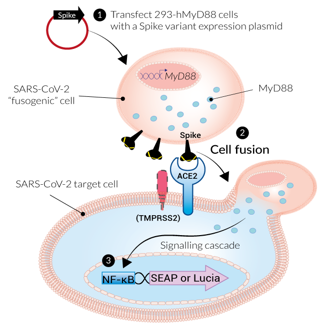 These cells have been engineered to express a constitutively active human MyD88 [1]. Upon transient transfection, with a Spike expression plasmid, 293 hMyD88 cells become a SARS-CoV-2 mimic, which can then fuse with InvivoGen's permissive reporter cells (e.g. HEK Blue™ hACE2(TMPRSS2) and A549 Dual™ hACE2 TMPRSS2) [2].