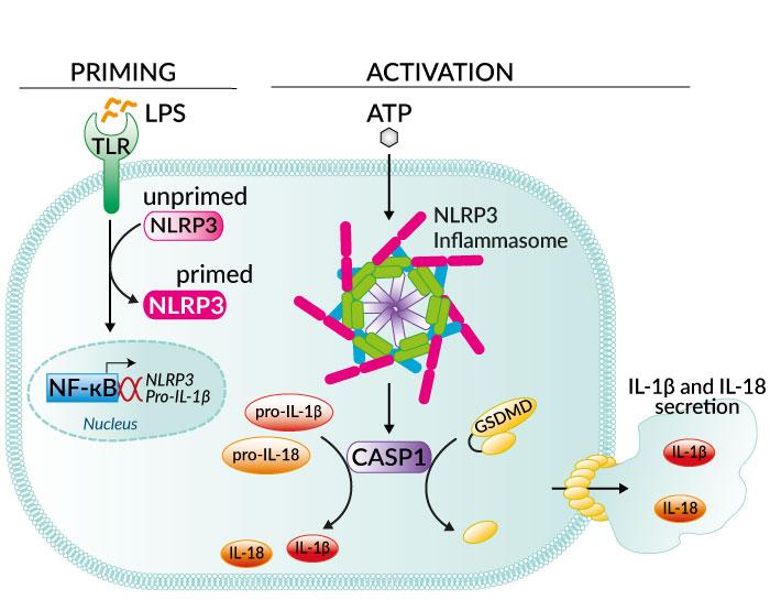 The NLRP3 inflammasome is an intracellular multi-protein complex that plays a central role in innate immunity. It is activated by a two-step process. A first signal (‘priming’) is provided by pathogen-associated molecular patterns (PAMPs) or cytokines. It allows the transcriptional upregulation of key inflammasome actors and the post-translational modification of NLRP3 . The second signal (‘activation’) is provided by a wide array of stimuli including microbial toxins, endogenous molecules or crystalline substances. The current paradigm is that NLRP3 does not bind directly to these molecules. Rather it senses downstream cytosolic stress signals such as K+ efflux. This triggers inflammasome multimerization and pro-caspase-1 maturation. Proximity-induced autolytic activation of caspase-1 leads to the formation of gasdermin D (GSDMD) pores at the cell surface, allowing IL-1β/IL-18 and alarmin secretion, and ultimately, pyroptosis [3,4].
