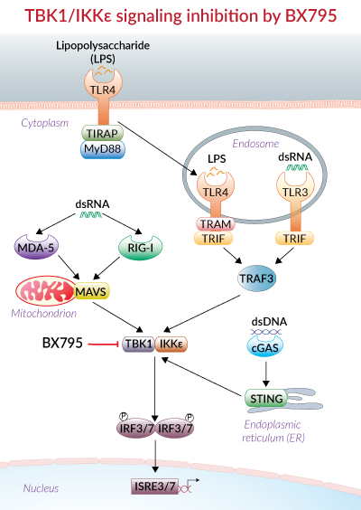 BX795 is a potent inhibitor of the noncanonical IkB kinases TANK-binding kinase 1 (TBK1) and IkappaB kinase-epsilon (IKKε) [1]. TBK1 and IKKε play a central role in the innate immune response. Notably, these noncanonical IkappaB kinase homologs are essential components of the interferon regulatory factor (IRF) signaling pathway.