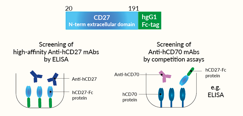 CD27 is a Type I transmembrane protein and a member of the TNFR family known as the sole receptor for CD70 (aka CD27L). In humans, CD27 is constitutively expressed on the majority of T cells, memory B cells and plasma cells, and natural killer (NK) cells. CD70 is primarily expressed on antigen-presenting cells (APCs). The CD70-CD27 interaction promotes T cell activation and maturation, in concert with the T cell receptor engagement [1]. The CD27/CD70 axis is thus considered a costimulatory immune checkpoint [2].