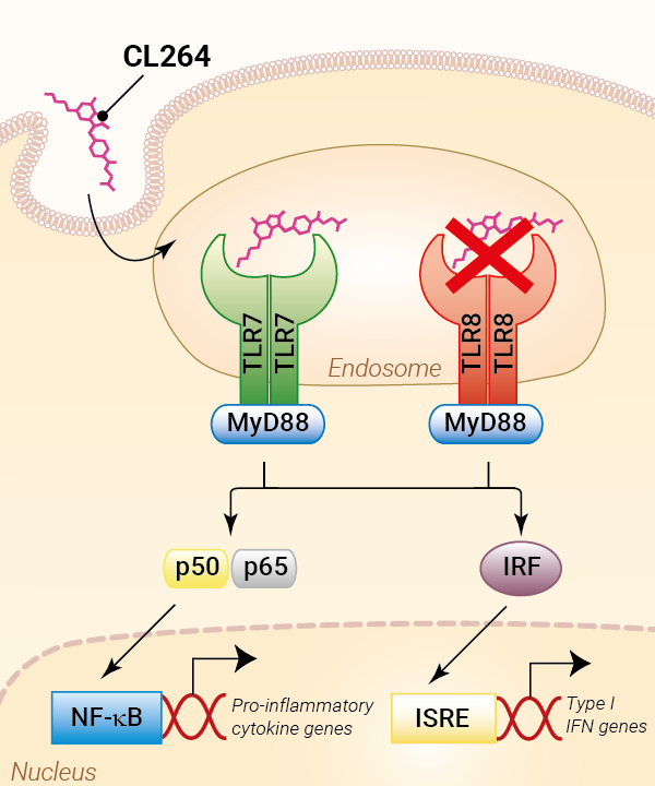 Using our HEK-Blue™ reporter cell lines expressing human or mouse TLR7 or TLR8, we established that CL264 is a human and mouse TLR7-specific agonist. It does not stimulate human or murine TLR8, even at high concentrations (> 10 µg/ml) (see figure). Moreover, CL264 is able to activate the TLR7-dependent NF-κB and IRF pathways, as assessed using InvivoGen's HEK-Dual™ reporter cell lines expressing two reporter genes for the NF-κB-inducible SEAP and IRF-inducible Lucia luciferase, as well as human TLR7 or TLR8 (see figure). CL264 triggers NF-κB activation at a concentration of 10 ng/ml which is ~30 times less than imiquimod.