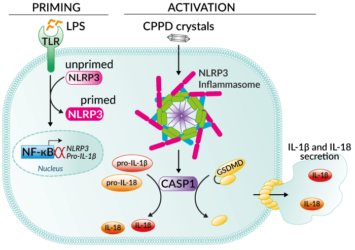Similar to uric acid, the causative agent of gout, CPPD crystals can act as endogenous danger signals that stimulate the innate immune system to produce inflammatory cytokines such as IL-1β. Engagement of the NRLP3 inflammasome is supported by the finding that macrophages from mice deficient in various components of the inflammasome did not respond to injection of CPPD crystals [1].