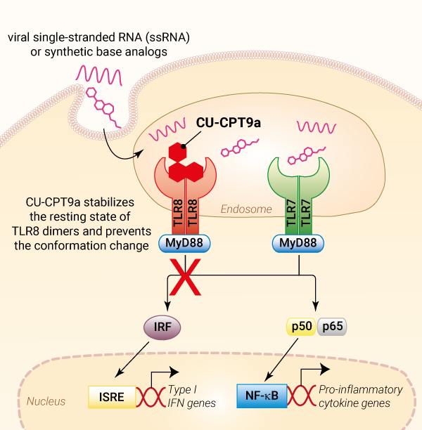 - CU-CPT9a binds directly to TLR8 and blocks the conformational change needed for activation.