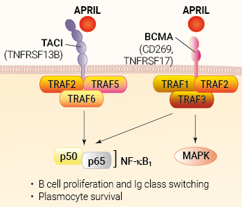 Recombinant human APRIL can be used together with HEK-Blue™ BCMA, or HEK-Blue™ TACI cells for the screening of inhibitory molecules, such as Sibeprenlimab, a monoclonal antibody targeting APRIL (see figures).