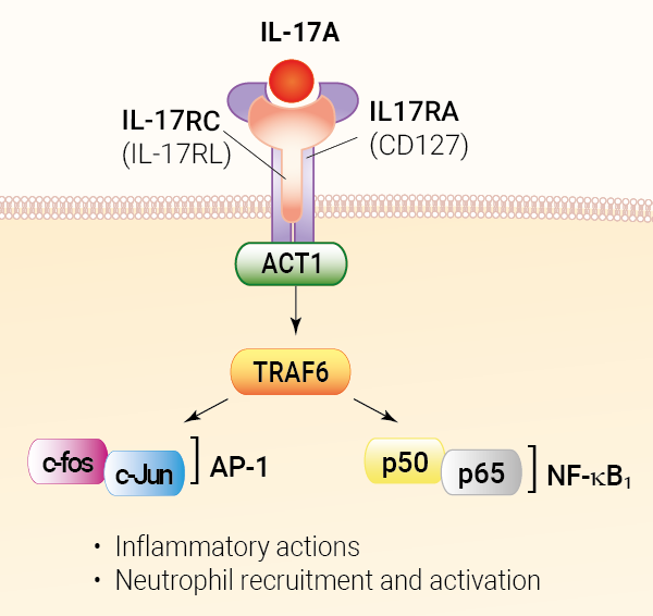 IL-17 cytokines exert their biological activities by binding to heterodimeric receptors containing the ubiquitous IL-17RA chain and a second IL-17R(C, B, or E) chain. IL-17A and IL-17F bind to the IL-17RA/IL-17RC receptor, IL-17C binds to the IL-17RA/IL-17RE receptor, and IL-17E binds to the IL-17RA/IL-17RB receptor [1, 2]. The activated heterodimeric receptor recruits the Act1 adaptor and induces the TNF receptor-associated factor 6 (TRAF6) ubiquitylation. This triggers a signaling cascade that results in NF-κB and AP-1 activation [1].
