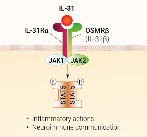 The cytokine interleukin 31 (IL-31) belongs to the Type I/II cytokine receptor family, and more specifically to the IL-6/gp130 family. IL-31 signals through a heterodimeric receptor comprised of the gp130-like subunit IL-31Rα and the OSMRb (oncostatin M receptor) subunit. The binding of IL-31 to its receptor triggers activation of the JAK/STAT, Akt/PI3K, and MAPK signaling pathways [1,2]. IL-31 receptor complex is expressed in epithelial, neuronal as well as immune cells. Little is known about the physiological function of IL-31. It is mainly secreted by IL-4-activated T cells, thereby contributing to Th2-weighted inflammation [1,2]. Several reports indicate that IL-31 is implicated in disorders such as atopic dermatitis, asthma, and inflammatory bowel disease [1,2]. Of note, IL-31 appears to be a critical cytokine involved in neuro-immune communication through the mediation of inflammatory itch [1,2]. Targeting the IL-31 pathway is a promising therapeutic option for dermatologic and non-dermatologic diseases with enhanced IL-31 expression [1,2].