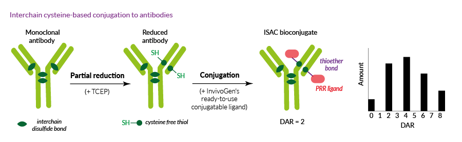 InvivoGen's ready-to-use conjugatable ligands, which feature an activated maleimide functional group, are suited for both interchain reduction or THIOMAB™ conjugation strategies.