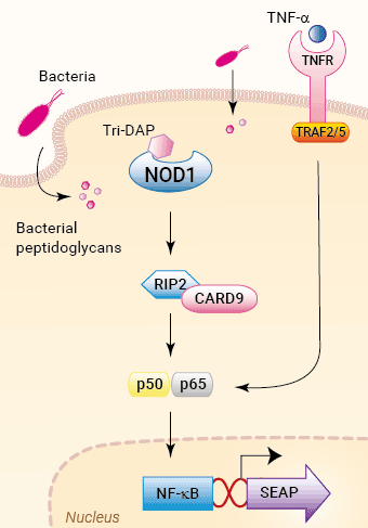 These cells stably express the human (h) NOD1 gene and an NF-κB-inducible SEAP reporter gene. SEAP (secreted embryonic alkaline phosphatase) activity upon NOD1 stimulation can be readily determined by performing the assay in HEK-Blue™ Detection. This cell culture medium allows for real-time detection of SEAP. Alternatively, SEAP activity may be monitored using QUANTI-Blue™, a SEAP detection reagent.