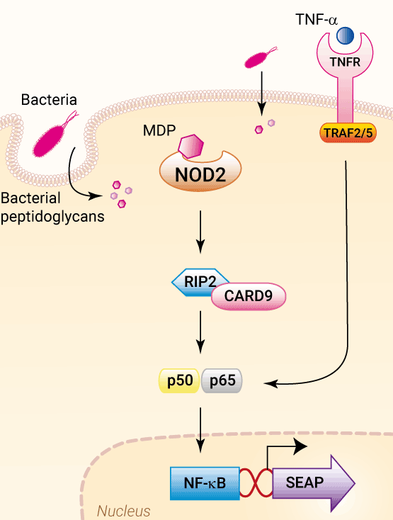 These cells stably express the human NOD2 gene and an NF-κB-inducible SEAP reporter gene. SEAP (secreted embryonic alkaline phosphatase) activity upon NOD2 stimulation can be readily determined by performing the assay in HEK-Blue™ Detection. This cell culture medium allows for real-time detection of SEAP. Alternatively, SEAP activity may be monitored using QUANTI-Blue™, a SEAP detection reagent.