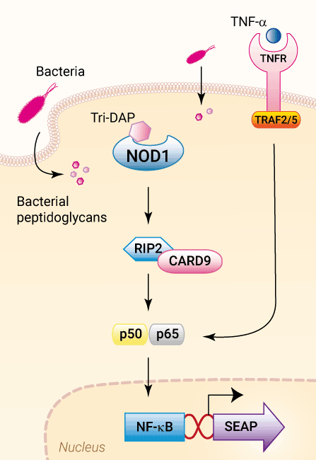 NOD1 and NOD2 are cytosolic pattern recognition receptors (PRRs), specialized to sense distinct motifs of peptidoglycan, an essential constituent of the bacterial cell wall. NOD1 senses the D-γ-glutamyl-meso-DAP dipeptide (iE-DAP), which is found in PGN of all Gram-negative and certain Gram-positive bacteria [1].