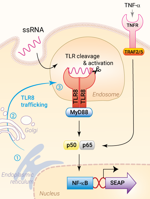Upon viral infection, TLR8 translocates from the endoplasmic reticulum via the Golgi into the endosomes. Subsequently, it undergoes proteolytic cleavage in order to facilitate dimer rearrangement [1,3]. While TLR7 dimerizes upon ligand binding, TLR8, which exists as an unliganded inactive dimer, performs structural reorganization after ligand recognition [4]. Once activated, TLR8 recruits the adaptor protein MyD88 to trigger IRF, AP-1, and NF-kB responses via TRAF6 (TNF receptor-associated factor 6) [1,3]. Depending on the stimulus and cell type, TLR8-mediated signaling induces Th1-type cytokine (IL-12) production [5].
