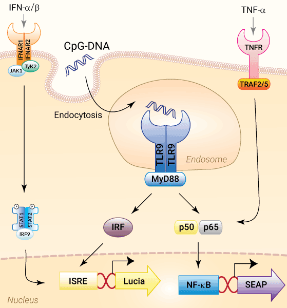 - Distinct monitoring of TLR9-dependent NF-κB or IRF activation by assessing the SEAP and Lucia luciferase activities