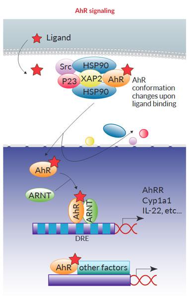 Inactive AhR resides in the cytoplasm within a Hsp90:XAP2:p23:Src protein complex. The AhR canonical genomic signaling pathway occurs as follows: upon ligand binding, the complex undergoes conformational changes and translocates into the nucleus. AhR heterodimerizes with AhR nuclear translocator (ARNT) before binding to dioxin response elements (DREs) in the upstream regulatory regions of AhR target genes, such as the cytochrome P450-dependent monooxygenase Cyp1a1, the AhR repressor (AhRR), and the IL-22 interleukin.