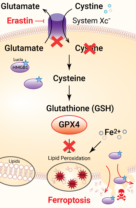Upon ferroptotis activation, the cell membrane ruptures and HMGB1::Lucia is released into the extracellular milieu. Levels of HMGB1::Lucia in the supernatant can be readily monitored by measuring the light signal produced after the addition of QUANTI-Luc™ 4 Lucia/Gaussia, a Lucia® luciferase detection reagent (see figure).