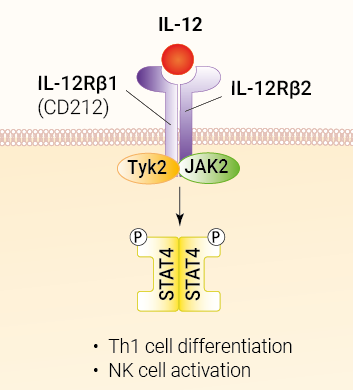 The binding of IL-12 to its IL-12Rβ1/IL-12Rβ2 heterodimeric receptor triggers a JAK2/TYK2 signal transduction leading to the activation of STAT4. Activated STAT4 forms homodimers that are translocated to the nucleus where they regulate the expression of target genes. Subsequent gene expression promotes the cytotoxic activity of Natural Killer (NK) and CD8+ T cells, and drives IFN-γ production by NK and activated CD4+ T cells [1, 2]. IFN-γ contributes to the differentiation of Th1 cells and inhibits Th2 cell development. Moreover, it enhances DC maturation and antigen presentation.