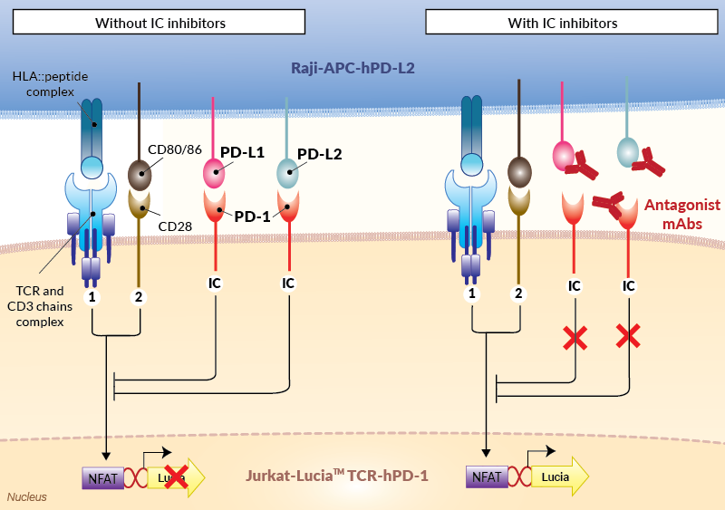 The immune synapse results from the activatory interactions of the TCR/[HLA::peptide] complex and CD28/CD80, and the concomitant inhibitory interactions of PD-1/PD-L1 and PD-1/PD-L2. These three interactions prevent the Jurkat-Lucia™ TCR-hPD-1 cells from expressing Lucia®.