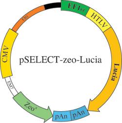 The pSELECT-zeo-Lucia plasmid contains the Zeocin® resistance marker for selection in both mammalian cells and bacteria.