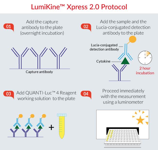 LumiKine™ Xpress 2.0 kits are sandwich ELISAs requiring only a single 2-hour incubation in which the cytokine binds to both an immobilized capture antibody, and to a detection antibody conjugated to Lucia® luciferase.