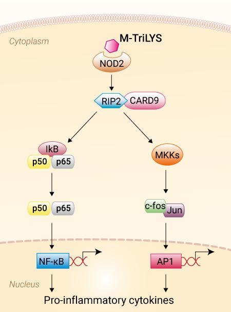 M-TriLYS (MurNAc-Ala-D-isoGln-Lys) is a chemically synthesized muramyl tripeptide. It is an agonist of the cytosolic receptor NOD2 [1]. NOD2 acts as a general sensor of bacterial invasion [2, 3].