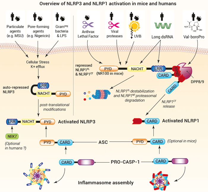 NLRP3 and NLRP1 differ in many aspects, including tissue expression, protein structure, and activation mechanisms. Moreover, while NLRP3 is highly conserved between humans and mice, it is not the case for NLRP1.