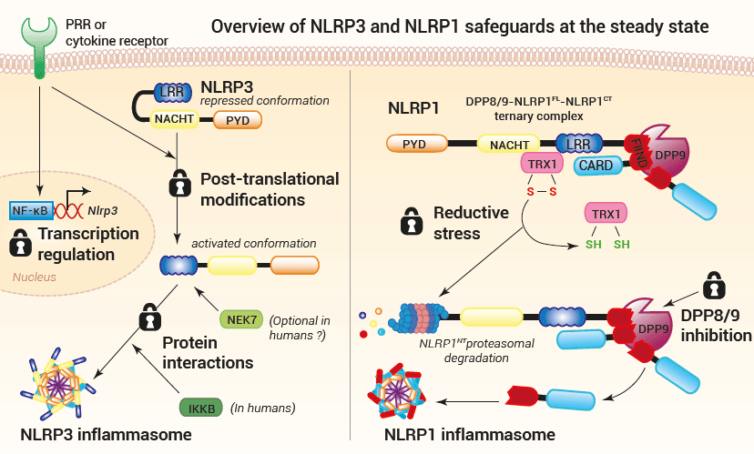 The frontier between the priming and activation for NLRP3 or NLRP1 sensors upstream of the inflammasome formation remains a major research axis.