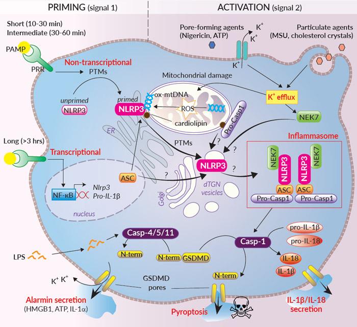 Activation of the NLRP3 inflammasome relies on a 2-signal model. Signal 1 is provided by microbial components or endogenous cytokines and primes NLRP3. Signal 2 is triggered by a plethora of stimuli and promotes NLRP3 activation and inflammasome assembly. This model is much more sophisticated than previously thought. Indeed, different priming mechanisms that depend on the stimulus’ nature and duration have been described. Short and intermediate priming triggers post-translational modifications (PTMs) such as phosphorylation and (de-)ubiquitylation of NLRP3 expressed at basal level. Longer priming triggers NF-κB-mediated transcription of NLRP3, pro-caspase-1, and pro-IL-1β. Primed NLRP3 remains in an auto-repressed state until activation2,4. NLRP3 can be activated by a wide range of stimuli that are structurally and chemically unrelated (e.g. pore-forming toxins, activators of ion channels, uric acid crystals, β-amyloid proteins) suggesting that NLRP3 doesn’t bind directly to these molecules. NLRP3 rather senses downstream cytosolic stress signals such as ion imbalances (e.g. K+ efflux), externalized mitochodrial (mt) cardiolipin and oxidized mtDNA, the two latter being proposed as NLRP3 ligands2-5. Yet, the exact mechanisms underlying NRLP3 activation remain a controversial topic4,6.