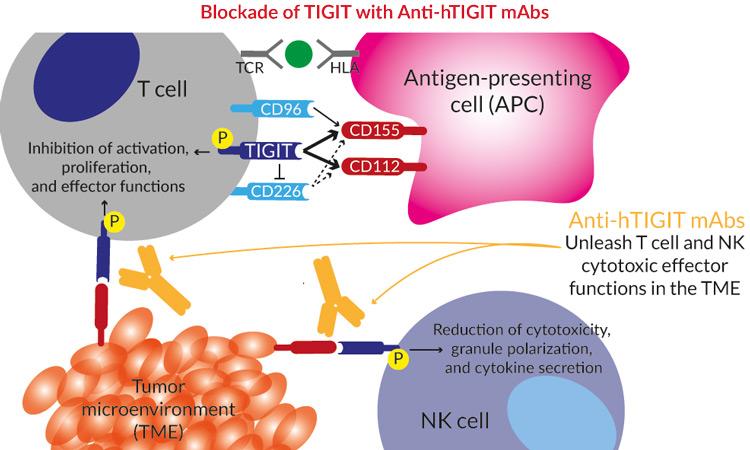 TIGIT (T cell immunoglobulin and ITIM domain) is an inhibitory checkpoint that has been implicated in tumor immunosurveillance [1]. TIGIT is specifically expressed on immune cells including, natural killer (NK) cells and a range of T cell subsets. TIGIT binds to CD155 (PVR) and CD112 (PVRL2, nectin-2), which are expressed on antigen-presenting cells (APCs), T cells, and a variety of non-hematopoietic cells including tumor cells. Interestingly, TIGIT competes with CD226 (also known as DNAM-1) and CD96 (also known as Tactile) for the same ligands [1,2]. Upon binding to its ligand, phosphorylation of TIGIT inhibits the NF-κB, P13K, and MAPK pathways, and leads to a strong reduction of NK cytotoxicity as well as inhibition of T cell activation, proliferation, and effector functions [2,3].