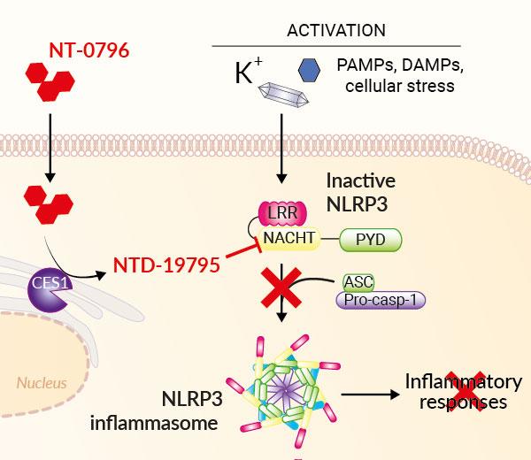 The NT-0796 is an ester pro-drug of the carboxylic acid active species NDT-19795 [1]. NT-0796 gets metabolized by carboxylesterase-1 (CES1) in the lumen of the endoplasmic reticulum (ER) to yield the active metabolite NDT-19795, which finally binds and inhibits the NLRP3 inflammasome [4]. Recent studies revealed that NTD-19795 binds to the NACHT domain of NLRP3, preventing the conformational changes required for inflammasome activation [1,3].