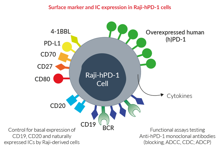 Raji-hPD-1 cells were developed from the Raji cell line, a human B lymphocyte-derived cell line. Raji cells have been successfully used as target cells in CAR-T toxicity assays as well as human effector studies such as antibody-dependent cellular cytotoxicity (ADCC), either with peripheral blood mononuclear cells, natural killer (NK) cells, or T cell-derived Jurkat reporter cells.