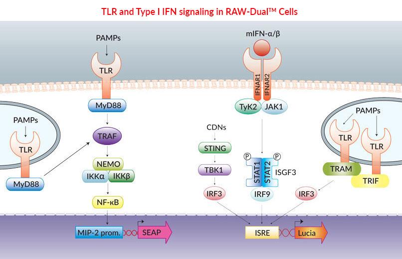 RAW-Dual™ (IRF-Lucia/KI-[MIP-2]SEAP) cells were generated from RAW 264.7 mouse macrophages, which express many pattern recognition receptors (PRRs) such as the Toll-like receptors (TLRs) TLR2 and TLR4 [1], the cytosolic DNA sensor (CDS) cGAS [2], and the cyclic dinucleotide (CDN) sensor STING [2].