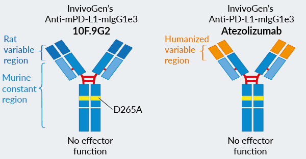 To overcome these issues, InvivoGen replaced the humanized (Atezo) and rat-derived (10F.9G2) constant regions with a murine constant region, making the mAbs ~65% of murine origin. Both mAbs now harbor an engineered murine IgG1 constant region (mIgG1e3). Within that region, a point mutation was introduced changing the aspartic (D) acid at position 265 to an alanine (A) (D265A). This leads to a complete loss of unwanted Fc-associated effector functions [5]. These alterations increase antibody performance and overcome immunogenic events, especially in vivo [6].