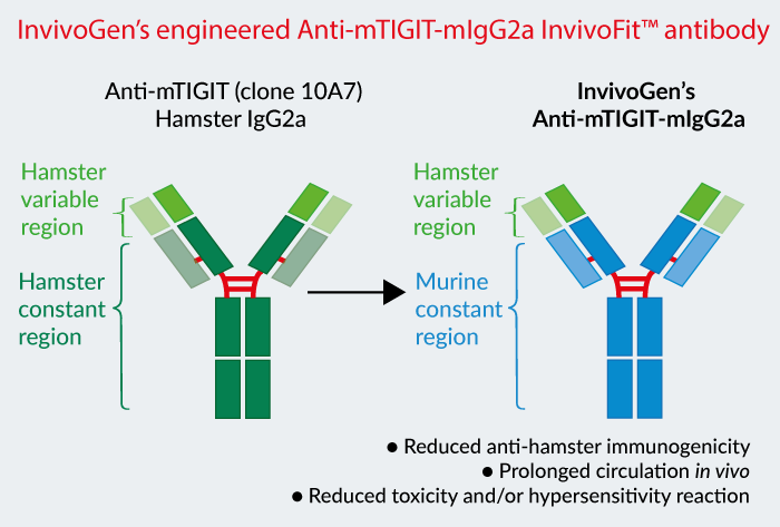 Anti-mTIGIT-mIgG2a InvivoFit™ is a recombinant murinized anti-mouse (m)TIGIT monoclonal antibody (mAb) featuring the variable region of the previously described 10A7 clone [1] and a mouse (m)IgG2a constant region.