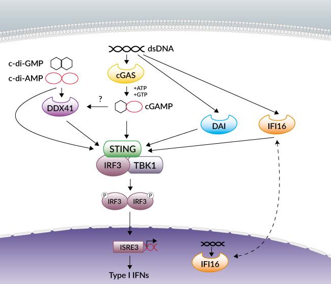 Recently, DDX41 was reported to bind c-di-AMP and c-di-GMP upstream of STING [4]. Although controversial, this finding raises the question whether the DNA sensor DDX41 can also bind cGAMP and thus acts between cGAS and STING. IFI16 is another DNA sensor that seems to be a key player in the innate immune response to DNA [5]. What is the role of IFI16 relative to cGAS and the other DNA sensors? Further studies are required and one can suspect that cell-type specificity will be found.