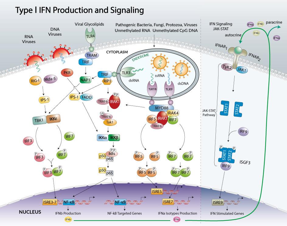 Type I IFNs are transcriptionally regulated, and are induced following recognition of pathogen components during infection by various host pattern recognition receptors. Virtually all humans cells are able to synthesize IFNα/β, however some cells have a more pronounced ability to produce these cytokines. Table 1 summarizes some characteristics of the three main pathways leading to the production of Type I IFN. The RIG-I pathway is activated upon infection by RNA viruses. The second pathway involves the adaptor protein TRIF which is recruited by TLR3 and TLR4. The last pathway is triggered by TLR7/8 and TLR9 leading to the activation of the transcription factor IRF7. Following their production, Type I IFNs trigger antiviral responses by binding to a common receptor (IFNAR). IFNα/β binding to IFNAR stimulates the JAK1-STAT pathway leading to the assembly of the ISGF3 complex which is composed of STAT1-STAT2 dimers and IRF9. ISGF3 binds to IFN-stimulated response elements (ISRE) in the promoters of IFN-stimulated genes to regulate their expression. Among these genes is IRF7 which initiates the transcription of a second wave of Type I IFNs. This autocrine/paracrine feed-back allows Type I IFNs to create an antiviral state in surrounding cells.
