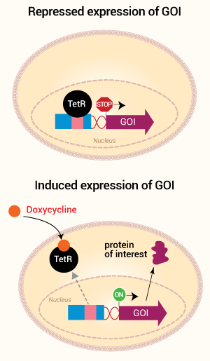 In the Tet-on conditional gene expression system, TetR is constitutively expressed and a gene of interest (GOI) is placed under the control of a strong promoter and tetO elements [1, 3]. TetR binds to the tetO sequences and represses the gene transcription. Upon incubation with doxycycline, TetR is released from the tetO sequences, and the GOI is transcribed [1, 3].