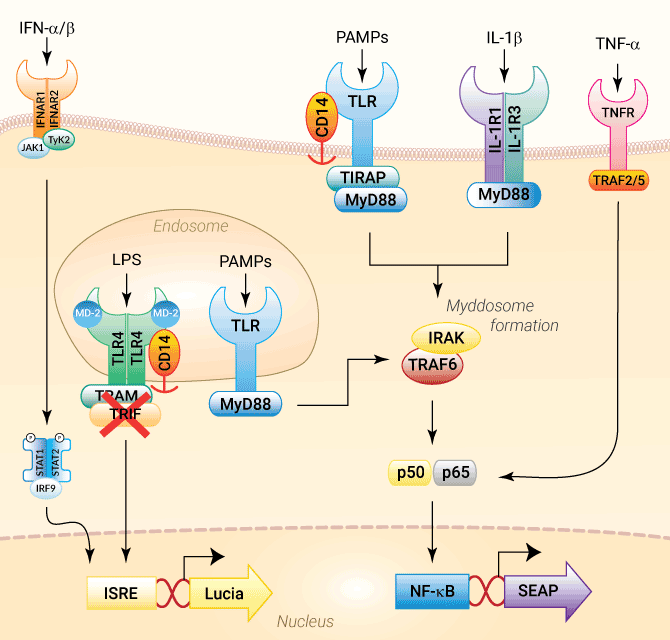 InvivoGen offers a monocytic cell line specifically designed to monitor the TRIF-dependent NF-kB and IRF responses when used in combination with its parental cell line THP1-Dual™: