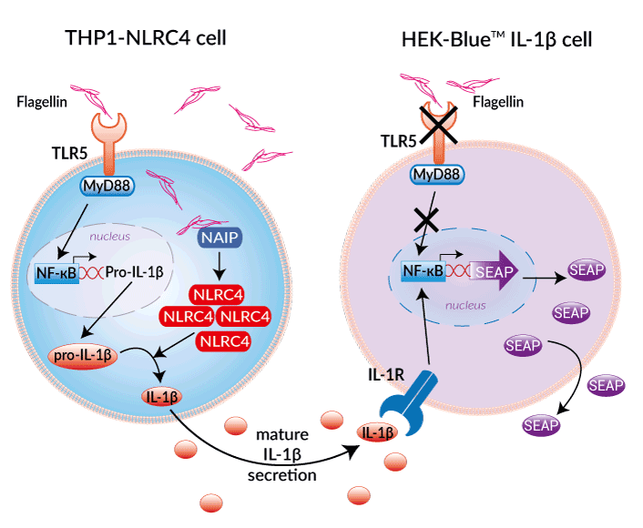 THP1-NLRC4 cells are derived from the THP-1 human monocytic cell line. They stably overexpress NLRC4 and naturally express TLR5, two pattern recognition receptors for flagellins. Thus, their incubation with flagellins triggers TLR5 activation at the cell surface and NLRC4/NAIP inflammasome assembly in the cytosol. TLR5 signaling leads to NF-κB activation and pro-IL1β expression. NLRC4/NAIP inflammasome activation leads to caspase-1-mediated maturation and secretion of IL-1β. The level of bioactive IL-1β in the supernatant can be monitored using HEK-Blue™ IL-1β cells.