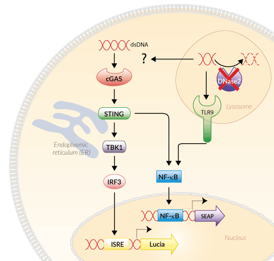 Defects in DNase2 functions allow undigested DNA fragments to leak into the cytosol and trigger the STING-TBK1-IRF3 signaling pathway [1]. As a consequence, pro-inflammatory cytokines (e.g., IFN-β) are constitutively expressed, causing interferonopathies and other autoimmune disease phenotypes (e.g. severe anemia, arthritis) [2,4].