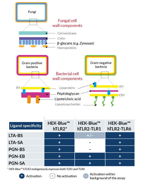 Importantly, TLR2 forms a functional heterodimer at the cell surface with either TLR1 or TLR6. The ligand-specific activation of these heterodimers determines downstream signaling and ultimately, the immune response [1]. InvivoGen has functionally validated the purified cell-wall components on our HEK-Blue™ hTLR2 cell collection to identify their potential to activate TLR2-TLR1 or TLR2-TLR6, or both (see figure).