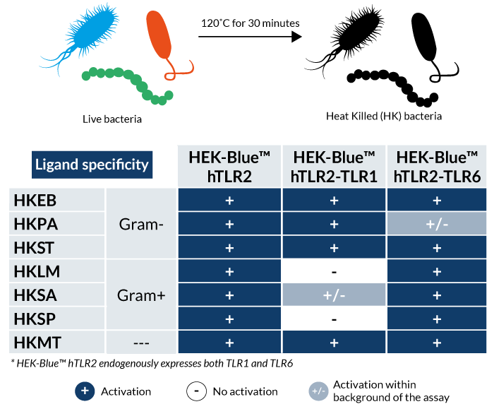 InvivoGen offers a collection of freeze-dried preparations of heat-killed (HK) Gram-positive (e.g. Staphylococcus aureus and Listeria monocytogenes) and Gram-negative bacteria (e.g. Pseudomonas aeruginosa and Salmonella typhimurium). Furthermore, we have functionally validated the HK bacteria on our HEK-Blue™ hTLR2 cell collection to identify their potential to activate TLR2-TLR1 or TLR2-TLR6, or both (see figure).