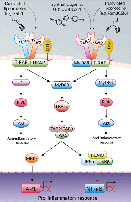 Upon ligand recognition, TLR2-dependent signaling cascades ultimately lead to a MyD88 and MAL/TIRAP-dependent activation of pro-inflammatory transcription factors such as NF-κB and AP-1 [6]. Additionally, the PI3K/Akt pathway may also be activated leading to the production of anti-inflammatory cytokines [7]. Interestingly, microarray data generated by InvivoGen clearly highlights that downstream effects differ depending on whether it’s the TLR2-TLR1 or TLR2-TLR6 heterodimer that is activated upon ligand recognition.