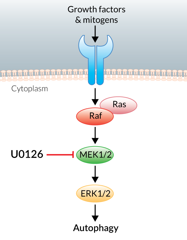 U0126 acts by inhibiting the kinase activity of MEK1/2 thus preventing the activation of extracellular signal-regulated kinases 1 and 2 (ERK1/2; also called MAP kinases p44 and p42). ERK1/2 activation is central to different cell death programs, such as autophagy and apoptosis[2].