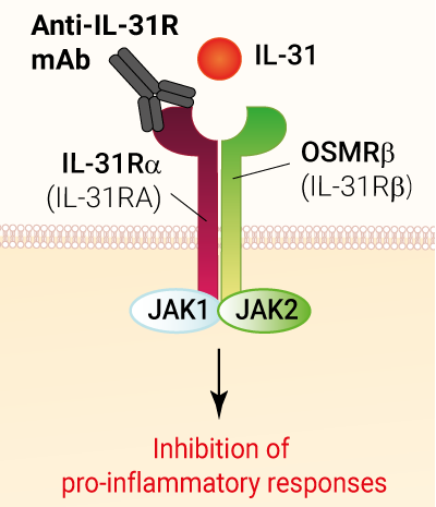 IL‐31, a member of the type I/II cytokine receptor family, is often referred to as the "itchy" cytokine [2]. Its binding to IL-31RA triggers the activation of the JAK/STAT, Akt/PI3K, and MAPK signaling pathways [2,3]. Little is known about the physiological function of IL-31. It is mainly secreted by IL-4-activated T cells, thereby contributing to Th2-weighted inflammation [2,3]. Several reports indicate that IL-31 is a pruritogenic cytokine that is highly implicated in disorders such as atopic dermatitis, asthma, and inflammatory bowel disease [2,3]. Thus, targeting the IL-31 pathway is a promising therapeutic option for dermatologic and non-dermatologic diseases with enhanced IL-31 expression [2,3].