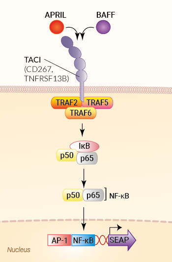 Transmembrane activator and calcium-modulator and cyclophilin ligand interactor (TACI) is a shared receptor for two agonists of the TNF (tumor necrosis factor) superfamily, BAFF (B-cell activating factor) and APRIL (proliferation-inducing ligand). TACI signaling regulates the survival and responses of mature B cells and plasma cells. Dysregulation in the BAFF-APRIL axis is associated with autoimmune diseases, including systemic lupus erythematosus (SLE) and rheumatoid arthritis (RA), as well as blood cancers. Elevated TACI levels have been detected on multiple myeloma (MM), hairy cell leukemia (HCL), and diffuse large B-cell lymphoma (DLBCL) cells.