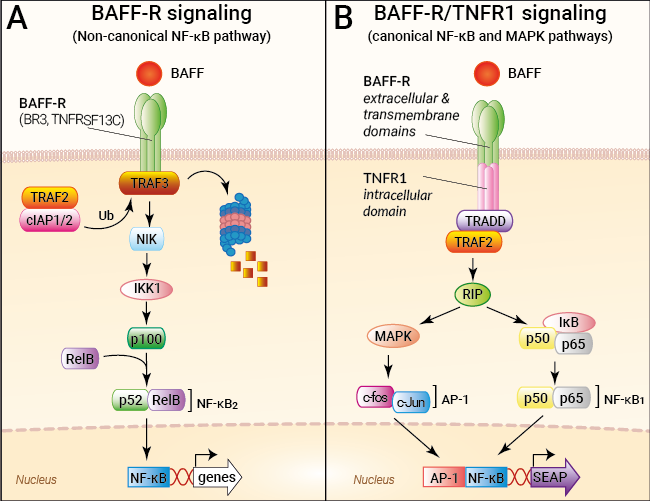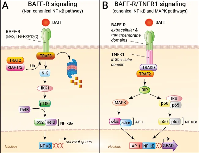 The best-described signal transduction from BAFF-R is the non-canonical NF-κB2 pathway [2-4]. Although not fully elucidated, a mechanism for NF-κB2 activation downstream of BAFF-R has been proposed to rely on proteins with E3 ubiquitin ligase functions. In the absence of BAFF, a complex of TRAF3, TRAF2, and cIAP1/2 ubiquitinates the NIK kinase, leading to its degradation. Conversely, BAFF binding to BAFF-R results in the recruitment of TRAF3 to the cytoplasmic domain of the receptor and subsequent redirection of the E3 ligases' activity to ubiquitinate TRAF3, causing its degradation. This allows for NIK stabilization and IKK1 activation. IKK1 phosphorylates NF-κB2, which is further processed and assembled into p52/RelB transcription factor dimer [3, 4]. BAFF-R signaling also activates PI3-kinases, ERK1/2 MAP kinases, and the IKK2-dependent canonical NF-κB1 pathway, although the mechanisms by which it does so are unclear [3, 4].