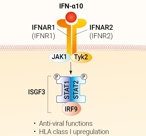 Type I interferons (IFN) include the IFN-α family, IFN-β, IFN-ε, IFN-κ, and IFN-ω. IFN-αs are important anti-viral cytokines that also have anti-proliferative and immuno-modulatory functions. The human IFN-α family comprises 13 genes encoding 12 proteins, with IFN-α13 being identical to IFN-α1. All IFN-αs bind to a common heterodimer receptor IFNAR1/IFNAR2. The ternary complex signals through the Janus kinase (JAK) and signal transducer and activator of the transcription (STAT) signaling pathway, inducing the formation of the ISGF3 transcriptional complex (STAT1/STAT2/IRF9). ISGF3 binds to IFN-stimulated response elements (ISRE) in the promoter regions of numerous IFN-stimulated genes (ISGs) [1].