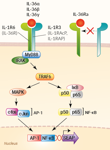 The cytokine interleukin 36 (IL-36) belongs to the IL-1 superfamily. Three isoforms, IL-36α, IL-36β, and IL-36γ, mediate pro-inflammatory functions, while a fourth one, IL-36Ra, acts as an antagonist [1,2]. IL-36 signalization requires the formation of a complex comprised of two subunits, IL-1R6 (aka IL-36R) and IL-1R3 (aka IL-1RAcP, IL-1 receptor accessory protein). The binding of agonist ligands to the IL-36R allows the recruitment of IL-1RAcP and the production of pro-inflammatory cytokines and chemokines through the activation of NF-κB and AP-1 [1,2]. The IL-36Ra antagonist inhibits the signaling by binding to IL-36R and preventing the recruitment of IL-1RAcP [1,2]. IL-36-associated immune response mainly takes place in barrier tissues, such as the skin, lungs, and intestines. Dysregulation of IL-36 isoform expression and signaling has been associated with inflammatory diseases such as psoriasis, rheumatoid arthritis, and inflammatory bowel disease [1,2].