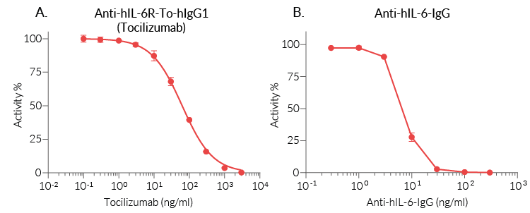 HEK-Blue™ IL-6 cells respond specifically to recombinant human IL-6, but not to mouse IL-6. The reliable and consistent performance of HEK-Blue™ IL-6 cells makes them suitable for release assays of therapeutic molecules that inhibit IL-6 signaling, such as Tocilizumab, a monoclonal antibody targeting the IL-6 receptor (see figures).
