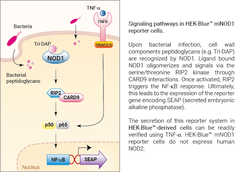 HEK-Blue™ mNOD1 cells were engineered from the human embryonic kidney HEK 293 cell line to assess the role of the Nucleotide-binding Oligomerization Domain-containing protein 1 (NOD1).