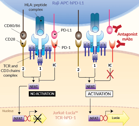 This assay relies on the co-culture of Jurkat-Lucia™ TCR-hPD-1 and Raji-APC-hPD-L1 cells.